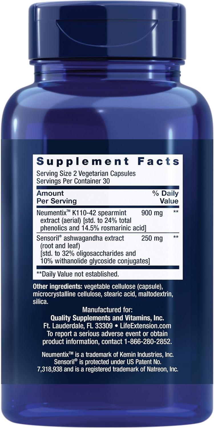 Life Extension Ashwagandha Plus Calm & Focus, ashwagandha Extract, Spearmint Extract, Focus, Attention, Relaxation, Advanced Formula, 60 Vegetarian Capsules