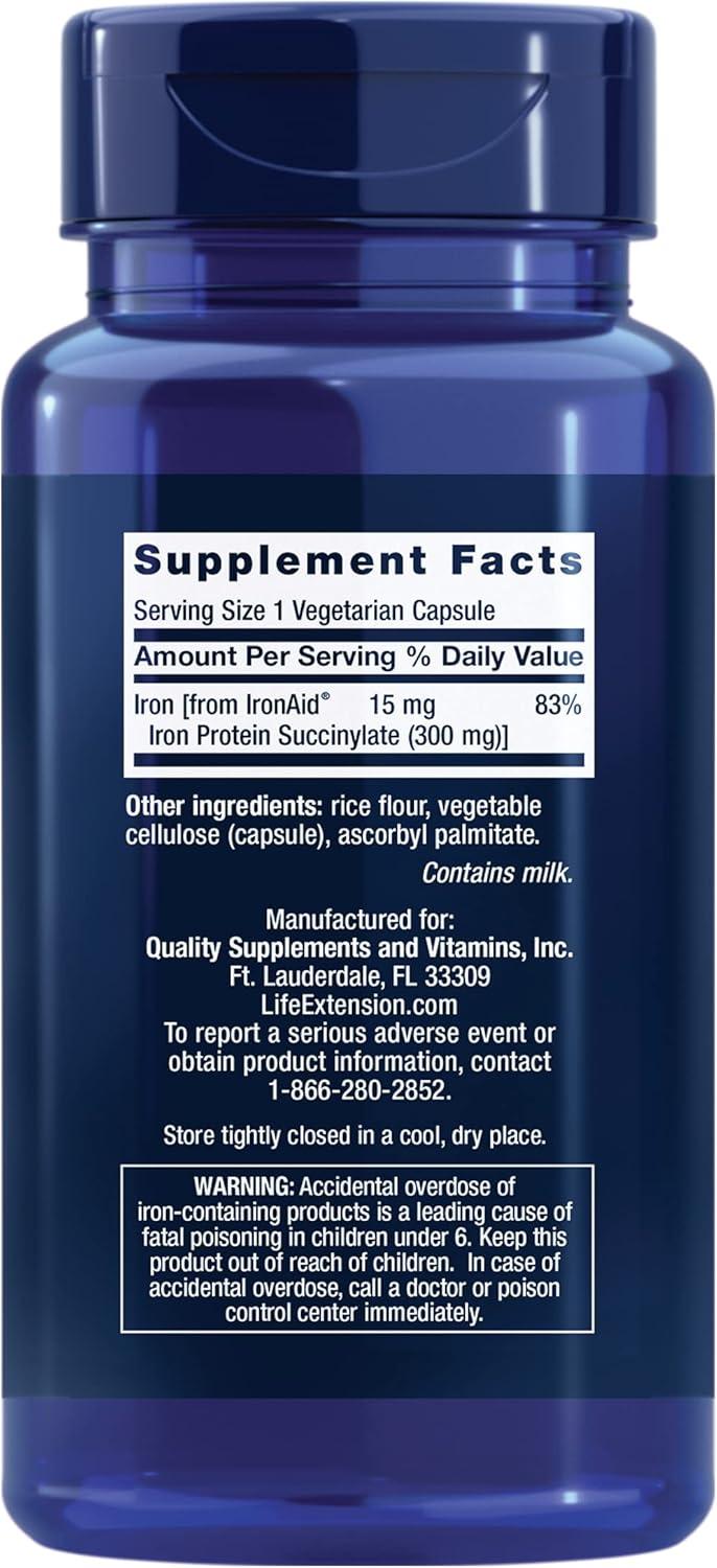 Life Extension Iron Protein Plus, Iron Protein succinylate, absorbable Iron Supplement for Whole-Body Health, Non-GMO, Gluten-Free, Vegetarian, 100 Capsules