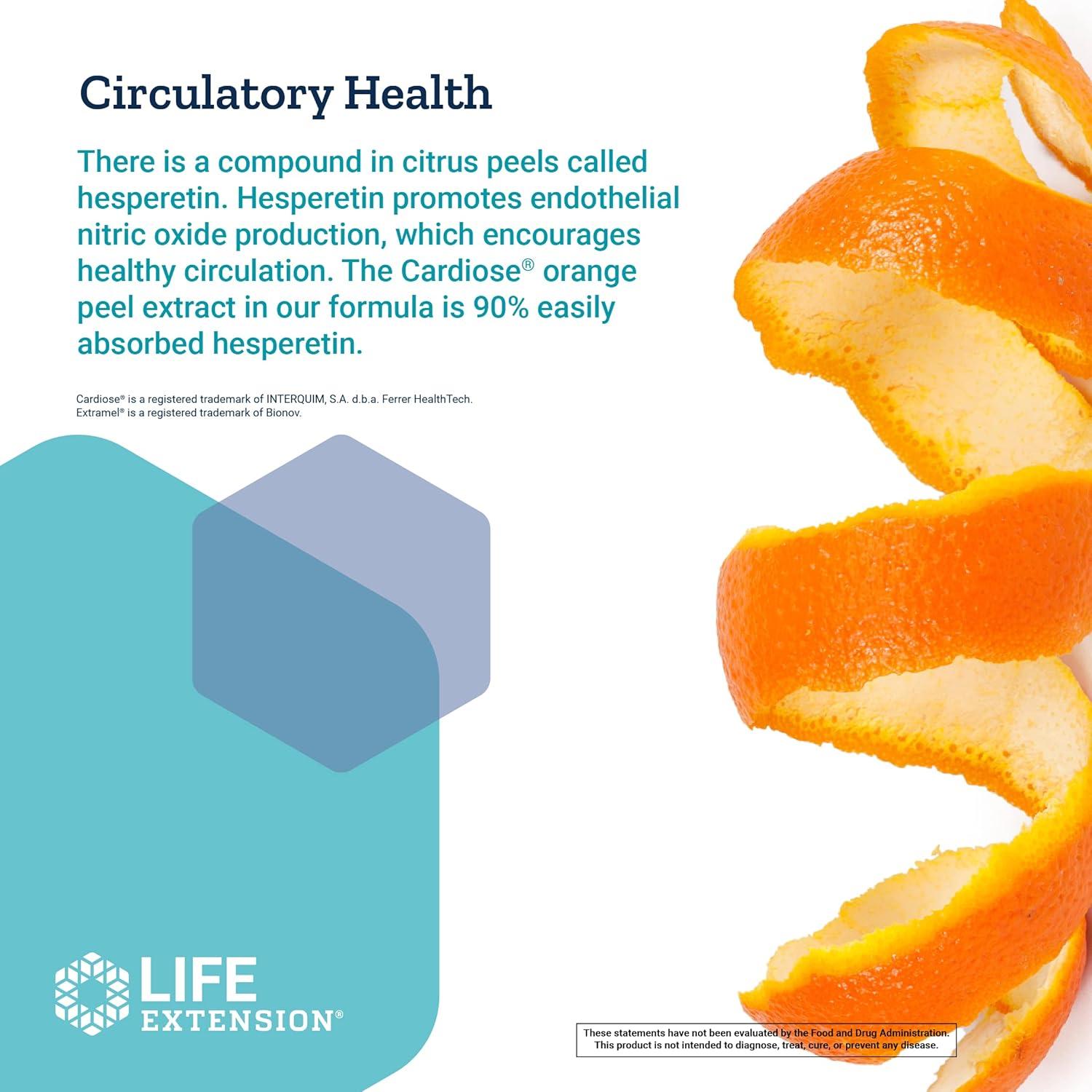 CIRCULATORY HEALTH – There is a compound in citrus peels called hesperetin. Hesperetin promotes endothelial nitric oxide production, which encourages healthy circulation. The Cardiose orange peel extract in our formula is 90% easily absorbed hesperetin.