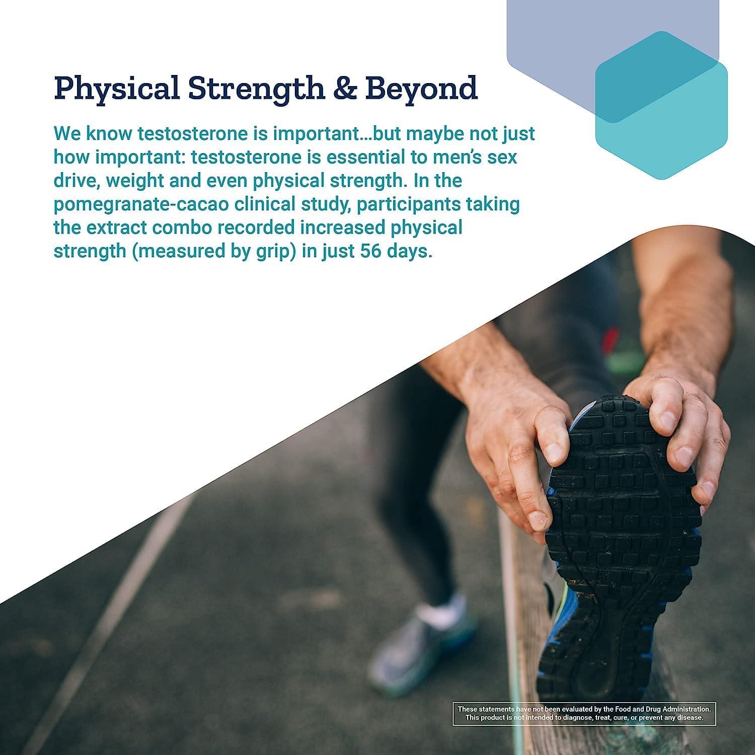 PHYSICAL STRENGTH & BEYOND–We know testosterone is important…but maybe not just how important: testosterone is essential to men’s sex drive, weight and even physical strength. In the pomegranate-cacao clinical study, participants taking the extract combo recorded increased physical strength (measured by grip) in just 56 days.